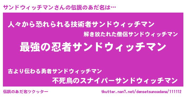 | 意味不明あだ名 | 『サンドウィッチマンフォーエバー』 |