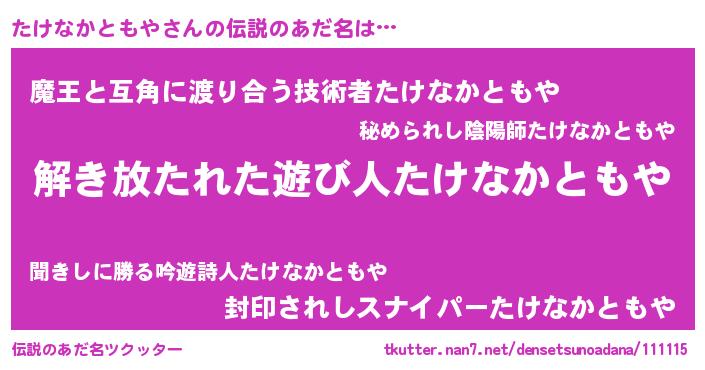 | 男性向けラノベタイトル風あだ名 | 『ダンジョンにたけなかともやを求めるのは間違っているだろうか』 |