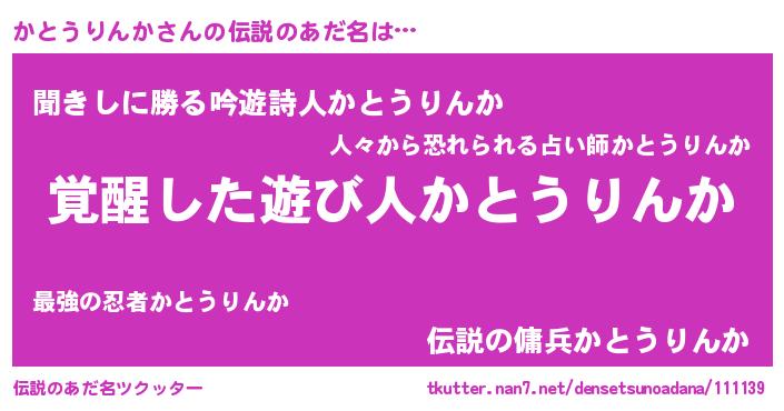 | 男性向けラノベタイトル風あだ名 | 『かとうりんかの嫁は女の子じゃないと思った?』 |