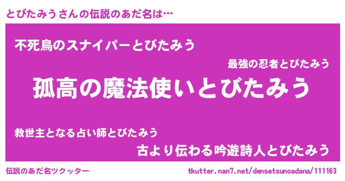 | 胡散臭い通販商品みたいなあだ名 | 『信頼と実績のサプリメント…その名も「とびたみう」』 |