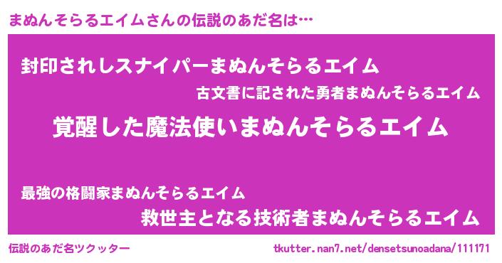 | 意味不明あだ名 | 『住所不定無職まぬんそらるエイム(1歳)』 |