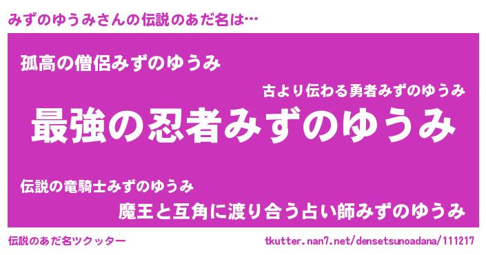 | 男性向けラノベタイトル風あだ名 | 『みずのゆうみ~年齢イコール彼女いない歴の魔法使い~』 |