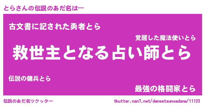 | ヒーロー風カッコイイあだ名 | 『慈愛の使者とら』『ネオトラ』 |