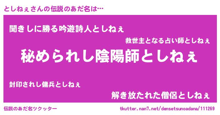 | 男性向けラノベタイトル風あだ名 | 『トシネェスレイヤー』 |