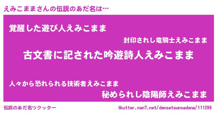 | ヒーロー風カッコイイあだ名 | 『ネオエミコママ』『天弓騎士エミ』 |