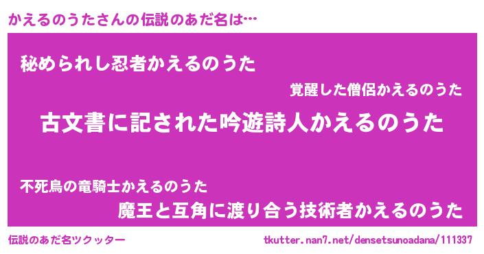 | 男性向けラノベタイトル風あだ名 | 『かえるのうたに滅ぼされるだけの簡単なお仕事です』 |