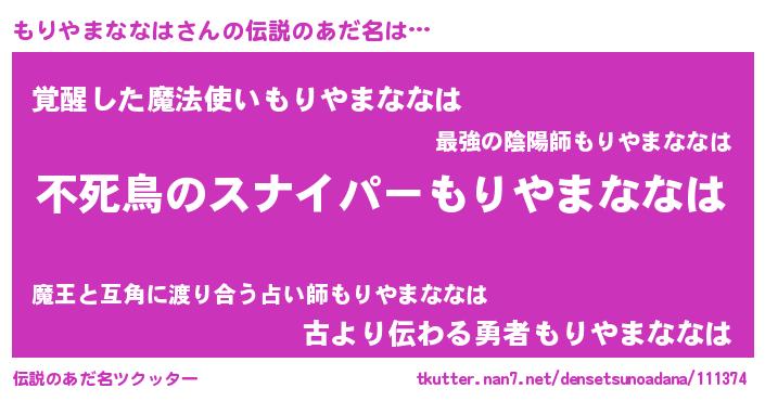 | 胡散臭い通販商品みたいなあだ名 | 『モテモテ間違いなし霊験あらたかなお札…その名も「もりやまななは」』 |