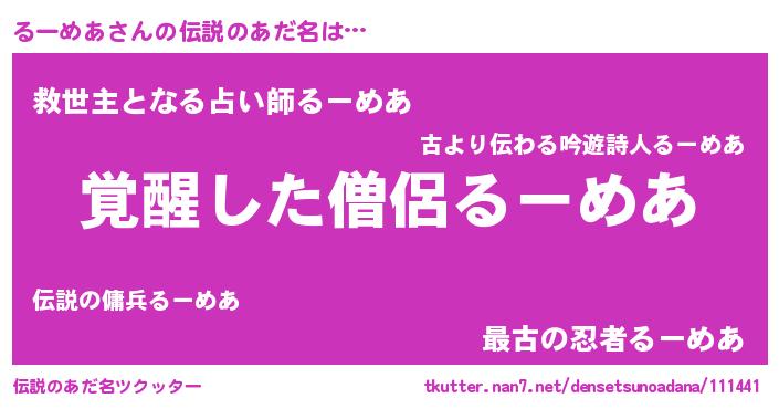 | 男性向けラノベタイトル風あだ名 | 『るーめあの嫁は女の子じゃないと思った?』 |