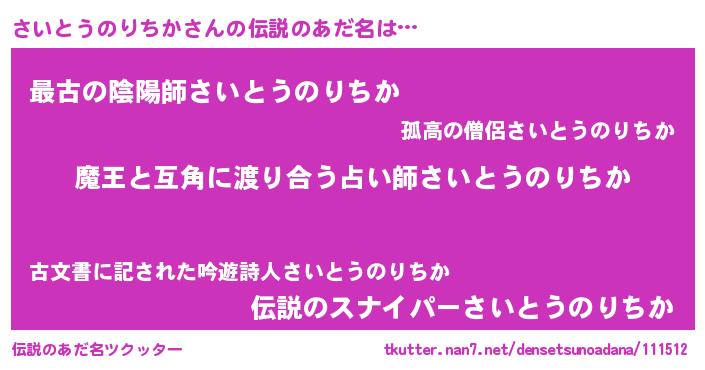 | 胡散臭い通販商品みたいなあだ名 | 『お金では代えられないイリジウム磁石…その名も「さいとうのりちか」』 |
