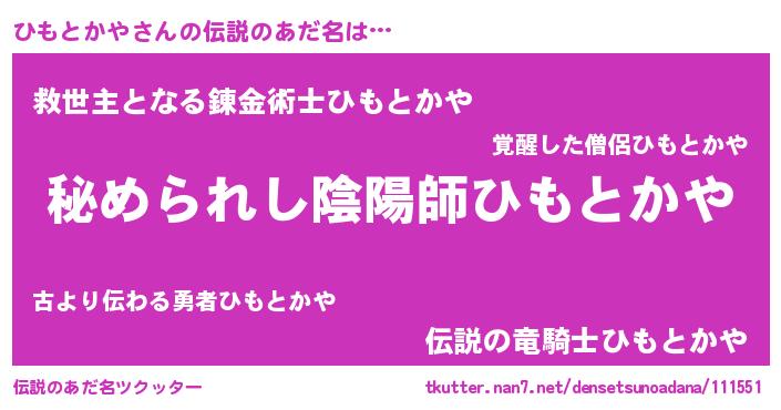 | 男性向けラノベタイトル風あだ名 | 『やはりひもとかやの青春ラブコメはまちがっている 』 |