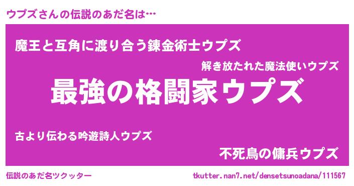 | 男性向けラノベタイトル風あだ名 | 『ウプズに滅ぼされるだけの簡単なお仕事です』 |
