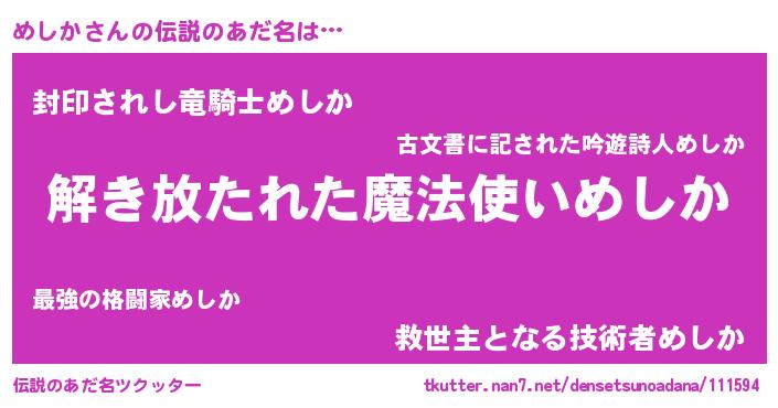 | 胡散臭い通販商品みたいなあだ名 | 『伝統あるサプリメント…その名も「めしか」』 |