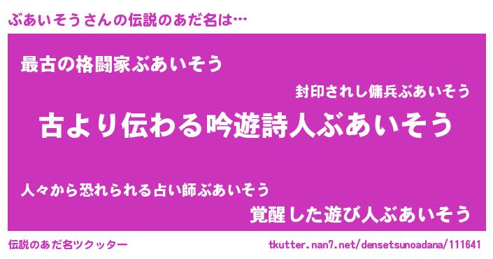 | ヒーロー風カッコイイあだ名 | 『ネオブアイソウ』『天弓騎士ブア』 |