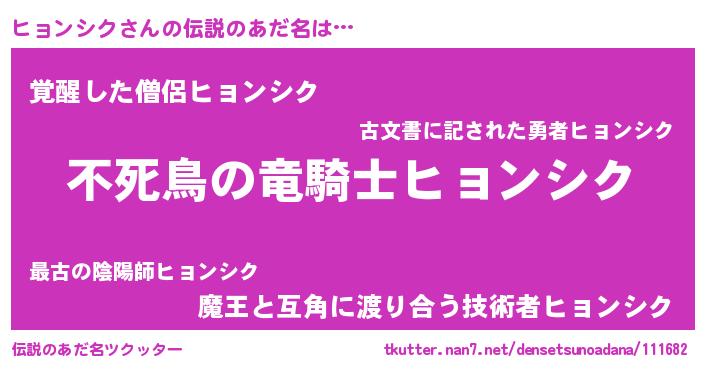 | 男性向けラノベタイトル風あだ名 | 『転生したらヒョンシクだった件』 |