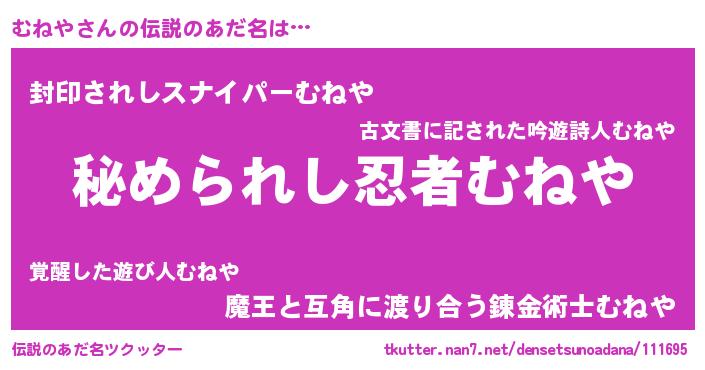 | ヒーロー風カッコイイあだ名 | 『ウルトラむねやマン』『スーパームネヤ』 |