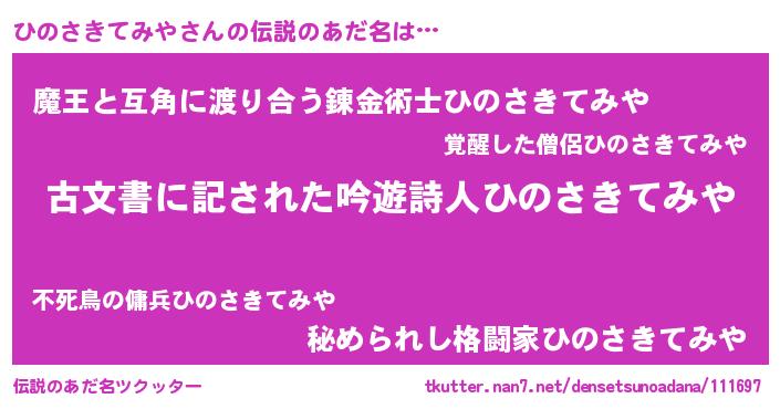 | 男性向けラノベタイトル風あだ名 | 『うちのひのさきてみやが世界を掌握している!』 |