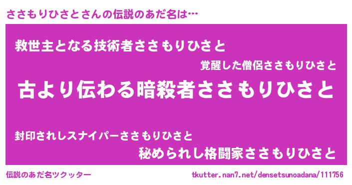 | 意味不明あだ名 | 『自称ささもりひさと』 |
