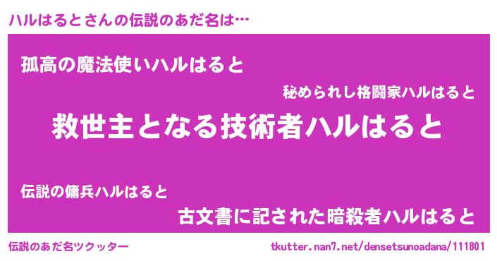 | ヒーロー風カッコイイあだ名 | 『最強戦士ハルハルト』『幻影騎士ハル』 |