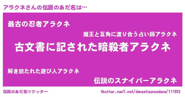 | 意味不明あだ名 | 『永久保存アラクネ』『ニラ科アラクネ属』 |