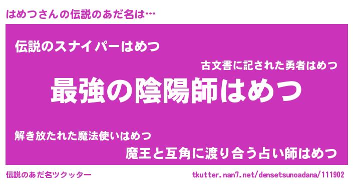 | 意味不明あだ名 | 『住所不定無職はめつ(95歳)』『自称はめつ』 |