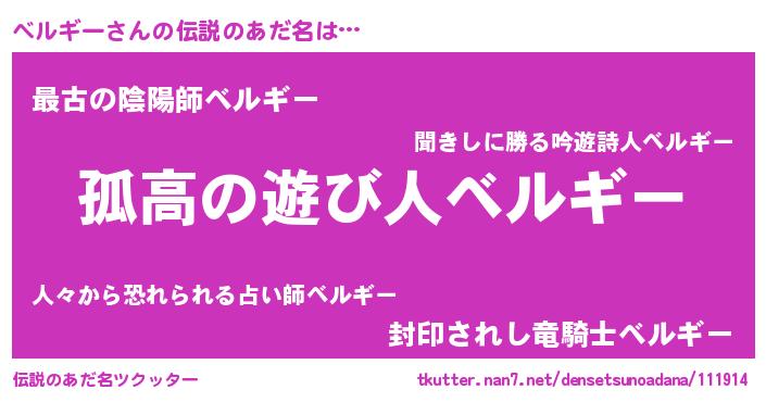 | ヒーロー風カッコイイあだ名 | 『暗黒騎士ベル』『超時空戦士ベルギー』 |