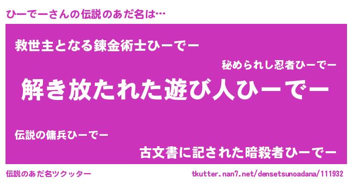 | ヒーロー風カッコイイあだ名 | 『幻影騎士ヒー』『慈愛の使者ひーでー』 |