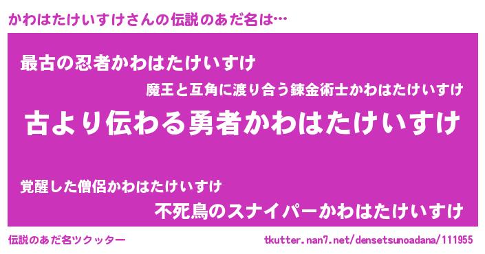 | 男性向けラノベタイトル風あだ名 | 『かわはたけいすけという概念が存在しない退屈な世界 』 |