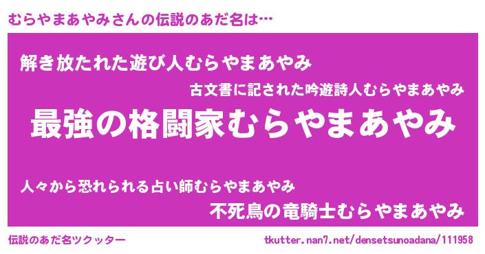 | 男性向けラノベタイトル風あだ名 | 『むらやまあやみに滅ぼされるだけの簡単なお仕事です』 |