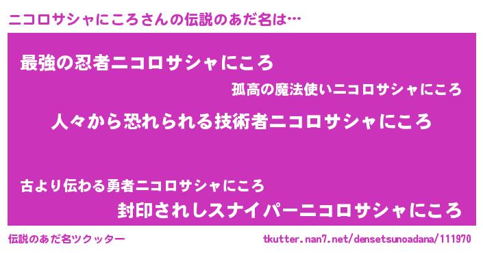 | 男性向けラノベタイトル風あだ名 | 『ニコロサシャニコロスレイヤー』 |