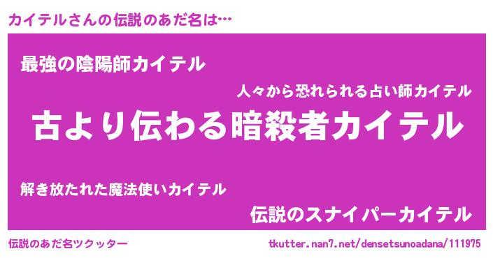 | 女子向けラノベタイトル風あだ名 | 『闇のカイテル』『カイテルの雑貨屋さん』 |
