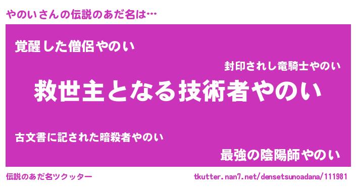 | ヒーロー風カッコイイあだ名 | 『慈愛の使者やのい』『究極戦士ヤノイ』 |