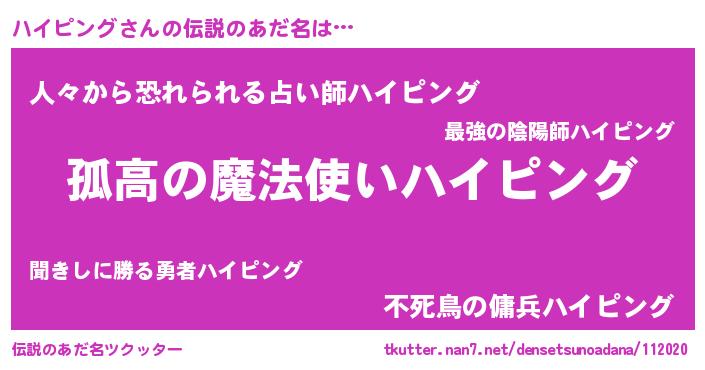 | 男性向けラノベタイトル風あだ名 | 『魔弾の王とハイピング』 |