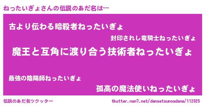 | 男性向けラノベタイトル風あだ名 | 『おまえをオタクにしてやるから、俺をねったいぎょにしてくれ! 』 |