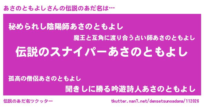 | 男性向けラノベタイトル風あだ名 | 『あさのともよしの憂鬱』 |