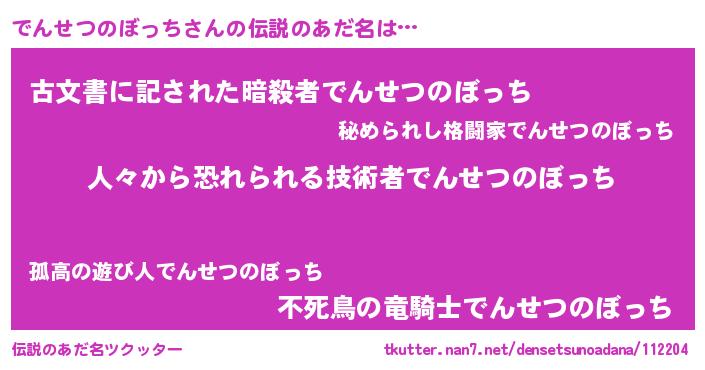 | ヘコむあだ名 | 『でんせつのぼっち(笑)』『でんにゅー』 |