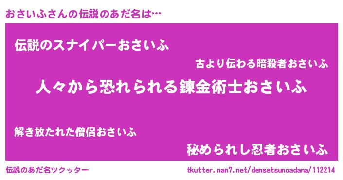 | 意味不明あだ名 | 『住所不定無職おさいふ(86歳)』 |