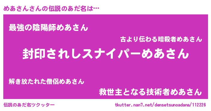 | 意味不明あだ名 | 『ペロリンめあさん』『自称めあさん』 |