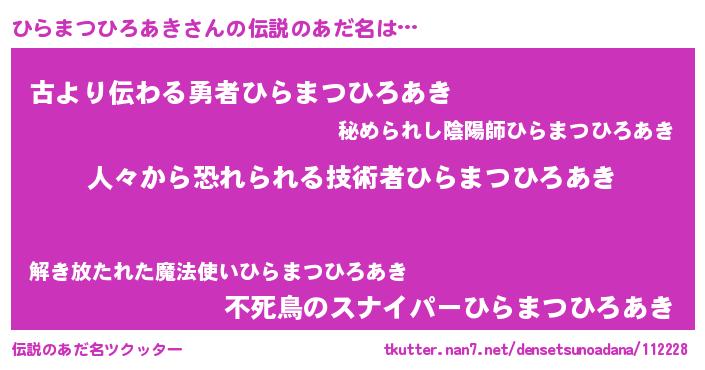 | ヘコむあだ名 | 『ひらまつひろあき(笑)』『ひらもー』 |