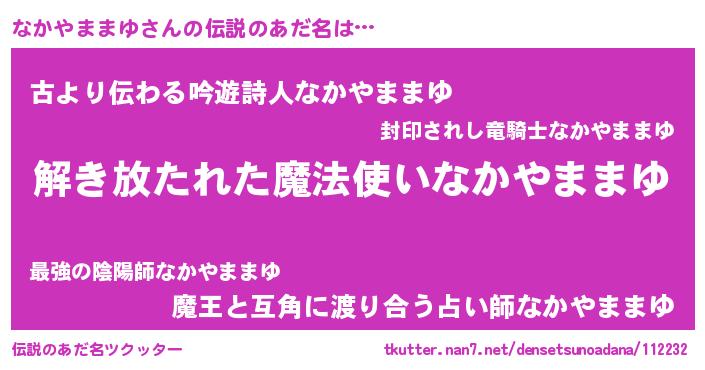 | 男性向けラノベタイトル風あだ名 | 『なかやままゆの嫁は女の子じゃないと思った?』 |