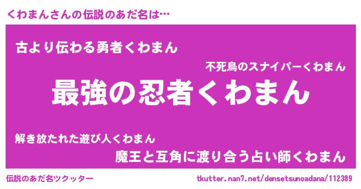 | 男性向けラノベタイトル風あだ名 | 『この素晴らしい世界にくわまんを!』 |