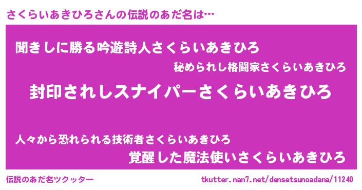 | 男性向けラノベタイトル風あだ名 | 『うちのさくらいあきひろが世界を掌握している!』 |