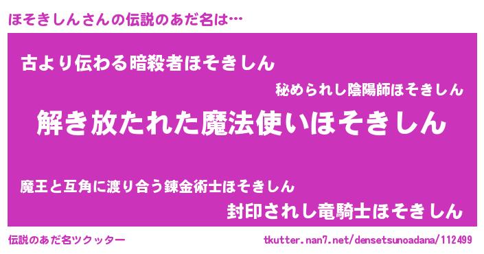 | 男性向けラノベタイトル風あだ名 | 『転生したらほそきしんだった件』 |