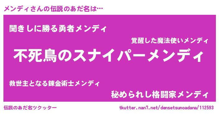 | 女子向けラノベタイトル風あだ名 | 『メンディ姫と円卓の騎士』 |