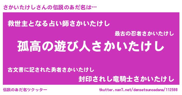 | ヒーロー風カッコイイあだ名 | 『魔戒騎士サカ』『スーパーサカイタケシ』 |