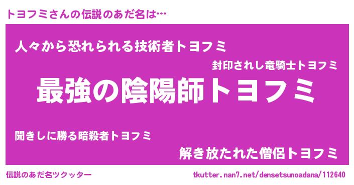 | 男性向けラノベタイトル風あだ名 | 『この素晴らしい世界にトヨフミを!』 |