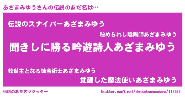 | 男性向けラノベタイトル風あだ名 | 『魔弾の王とあざまみゆう』 |