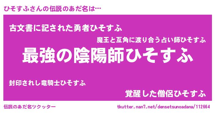 | 男性向けラノベタイトル風あだ名 | 『ひそすふ~年齢イコール彼女いない歴の魔法使い~』 |