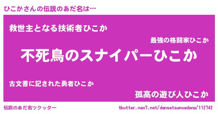 | 男性向けラノベタイトル風あだ名 | 『魔弾の王とひこか』『ひこかの憂鬱』 |