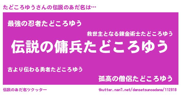 | ヒーロー風カッコイイあだ名 | 『仮面タドダー』『スーパータドコロユウ』 |