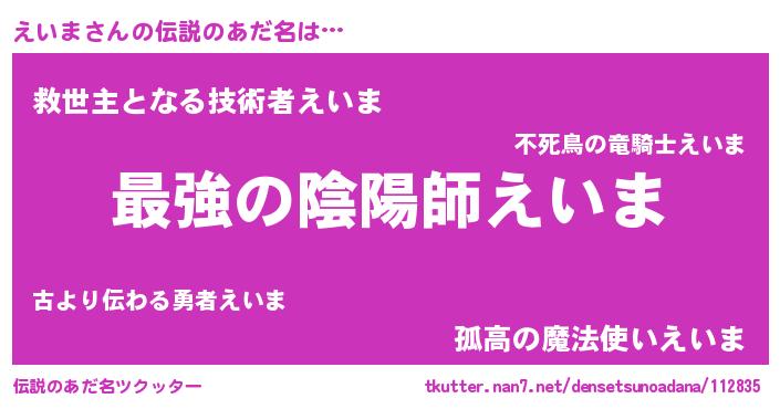 | 男性向けラノベタイトル風あだ名 | 『えいま~年齢イコール彼女いない歴の魔法使い~』 |